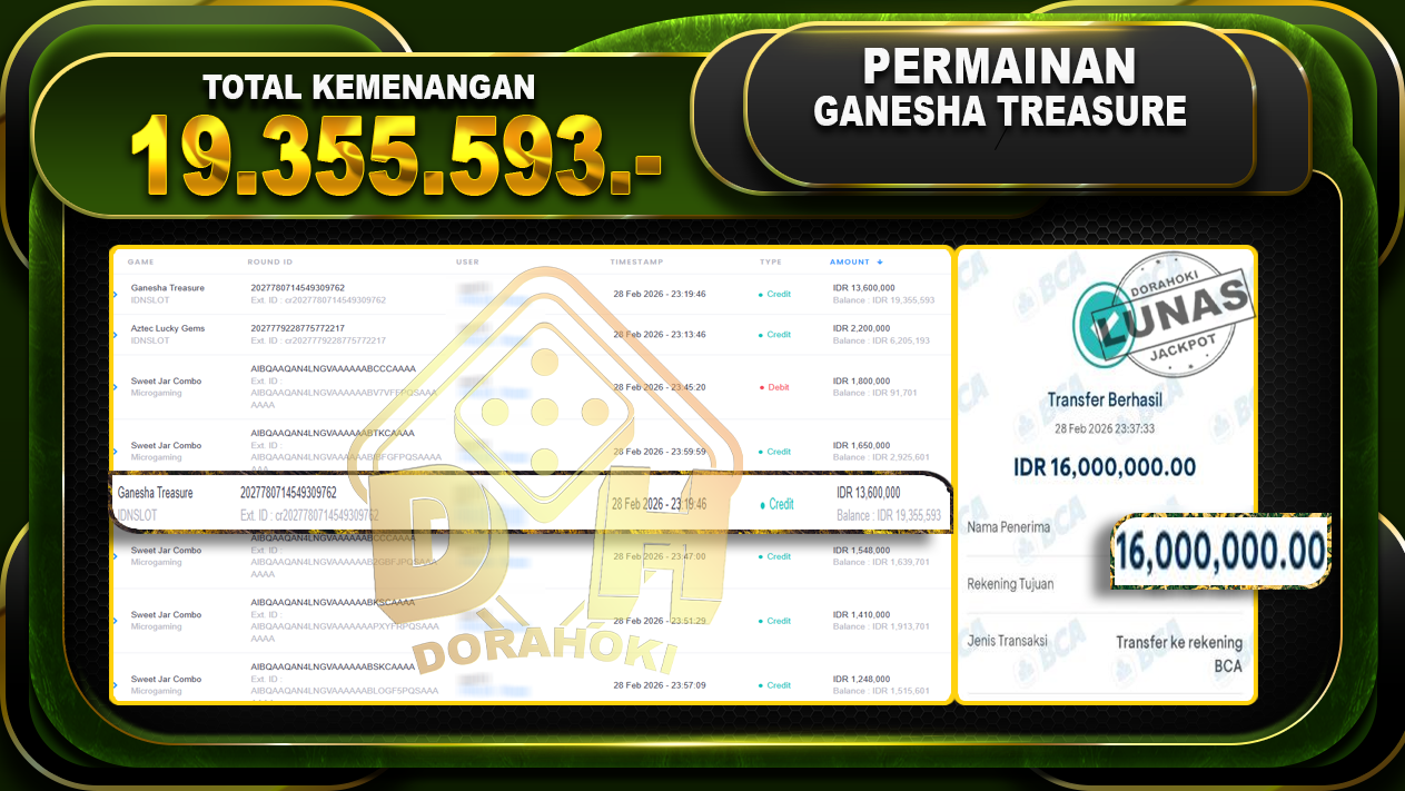 Bukti JP GANESHA TREASURE – ucapkan selamat kepada user id Usaxxx atas kemenangan di GANESHA TREASURE dengan total kemenangan Rp.19.355.593,- . Yang pasti nya langsung LUNAS Sesuai Bukti.