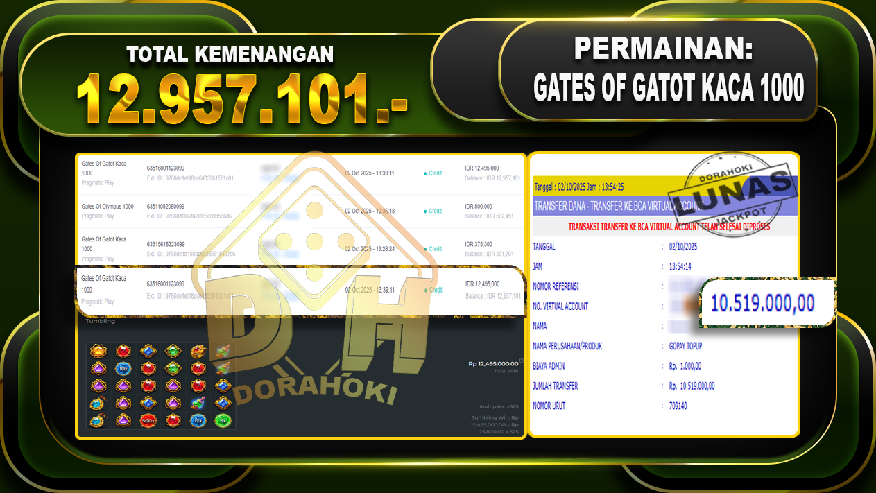 Bukti JP Gates Of Gatot Kaca 1000 – ucapkan selamat kepada user id sagxxxx atas kemenangan di Gates Of Gatot Kaca 1000 dengan total kemenangan Rp.12,957,101,- Yang pasti nya langsung LUNAS sesuai bukti ya bosku. Dorahoki nih bosku berapapun akan tetap kami bayar lunas ya bosku.