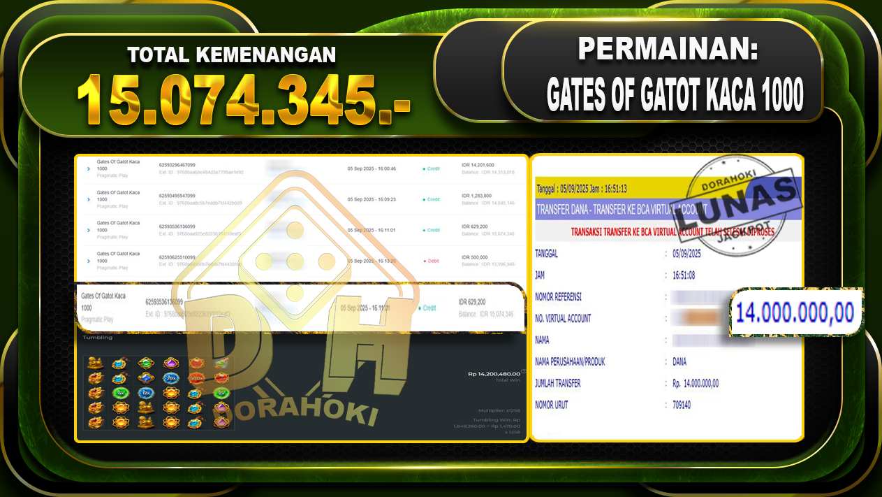 Bukti JP Gates Of Gatot Kaca 1000 – ucapkan selamat kepada user id Abxxxxx atas kemenangan di Gates Of Gatot Kaca 1000 dengan total kemenangan Rp.15,074,345,- Yang pasti nya langsung LUNAS sesuai bukti ya bosku. Dorahoki nih bosku berapapun akan tetap kami bayar lunas ya bosku.