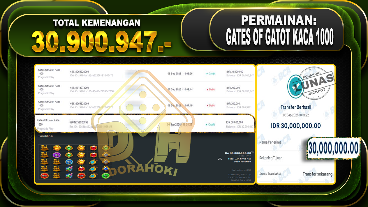 Bukti JP Gates Of Gatot Kaca 1000 – ucapkan selamat kepada user id Aanxxxxxxx atas kemenangan di Gates Of Gatot Kaca 1000 dengan total kemenangan Rp.30,900,947,- Yang pasti nya langsung LUNAS sesuai bukti ya bosku. Dorahoki nih bosku berapapun akan tetap kami bayar lunas ya bosku.