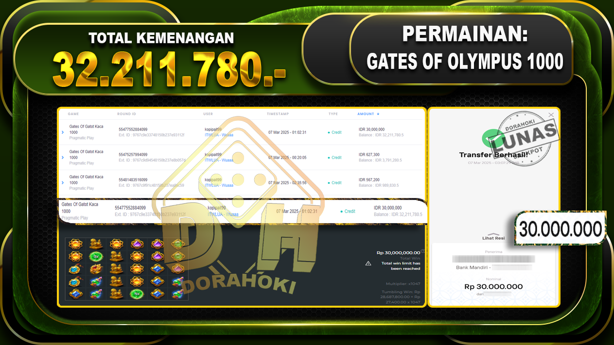 Bukti JP Gates Of Gatot Kaca 1000 – ucapkan selamat kepada user id Kopxxx atas kemenangan di Gates Of Gatot Kaca 1000 dengan total kemenangan Rp.32.211.780,- . Yang pasti nya langsung LUNAS sesuai bukti ya bosku. Dorahoki nih bosku berapapun akan tetap kami bayar lunas ya bosku.
