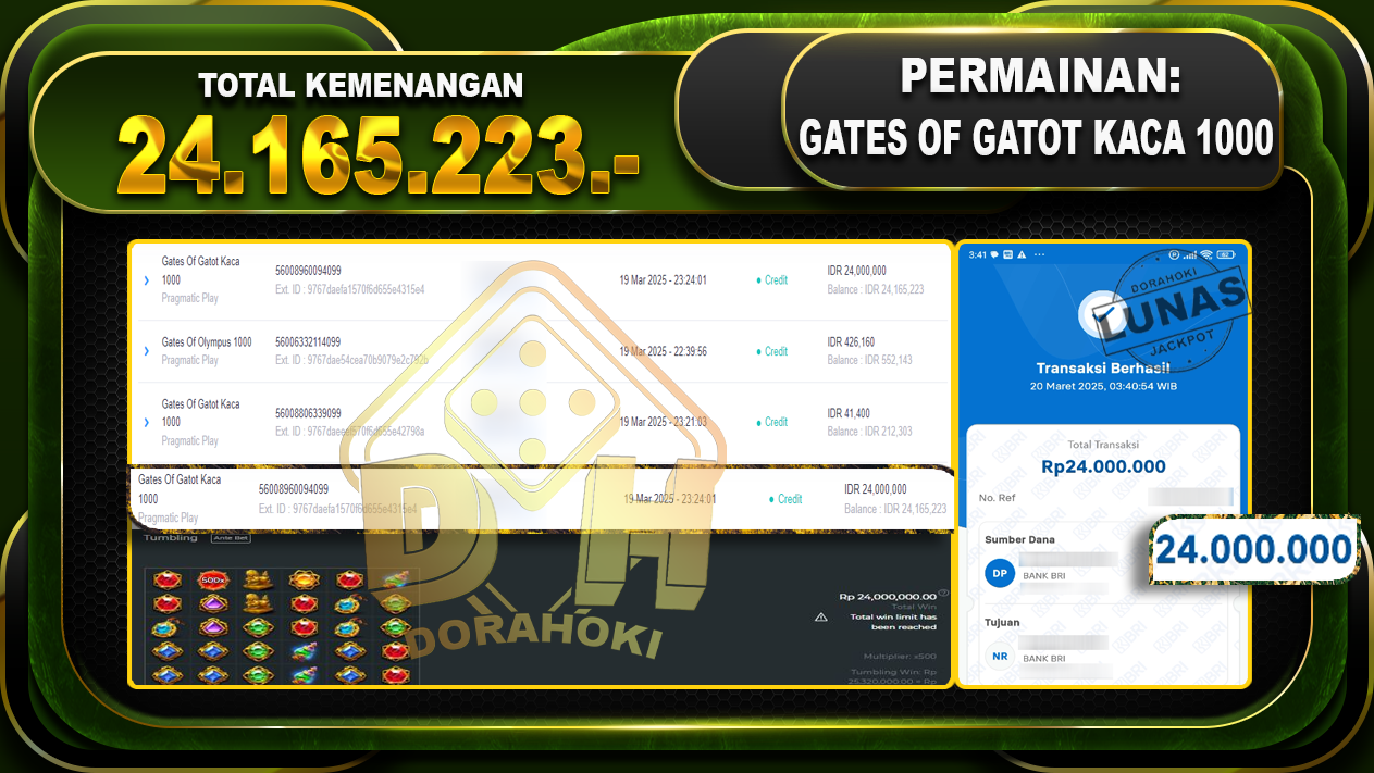Bukti JP Gates Of Gatot Kaca 1000 – ucapkan selamat kepada user id Nasxxx atas kemenangan di Gates Of Gatot Kaca 1000 dengan total kemenangan Rp.24.165.223,- . Yang pasti nya langsung LUNAS sesuai bukti ya bosku. Dorahoki nih bosku berapapun akan tetap kami bayar lunas ya bosku.
