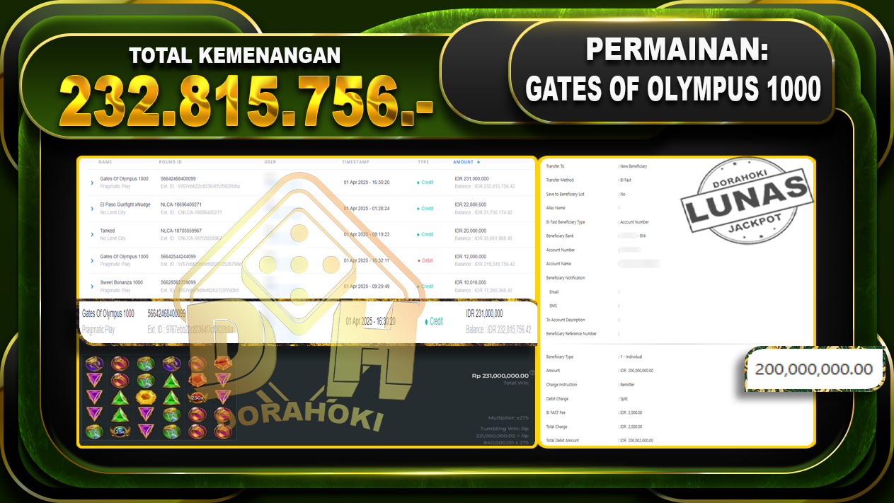 Bukti JP GATES OF OLYMPUS 1000 – ucapkan selamat kepada user id Jitxxx atas kemenangan di GATES OF OLYMPUS 1000 dengan total kemenangan Rp.232.815.756,- . Yang pasti nya langsung LUNAS sesuai bukti ya bosku. Dorahoki nih bosku berapapun akan tetap kami bayar lunas ya bosku.