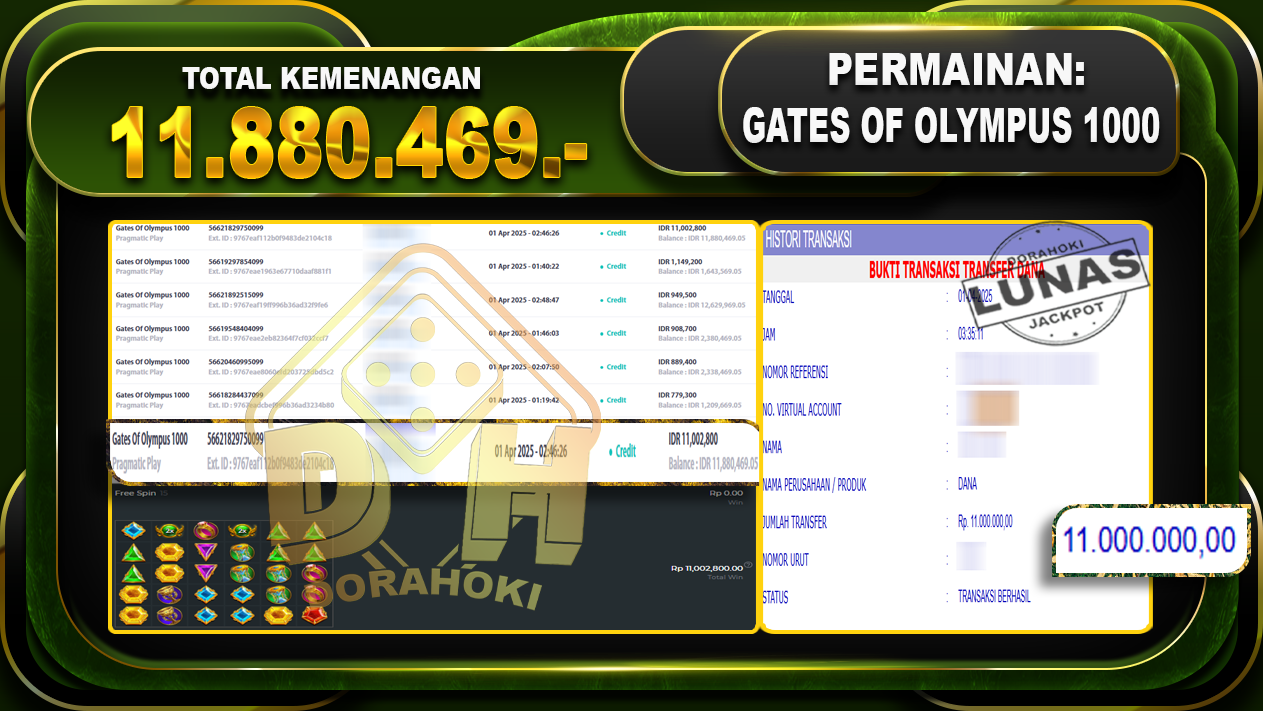 Bukti JP GATES OF OLYMPUS 1000 – ucapkan selamat kepada user id Parxxx atas kemenangan di GATES OF OLYMPUS 1000 dengan total kemenangan Rp.11.880.469,- . Yang pasti nya langsung LUNAS sesuai bukti ya bosku. Dorahoki nih bosku berapapun akan tetap kami bayar lunas ya bosku.