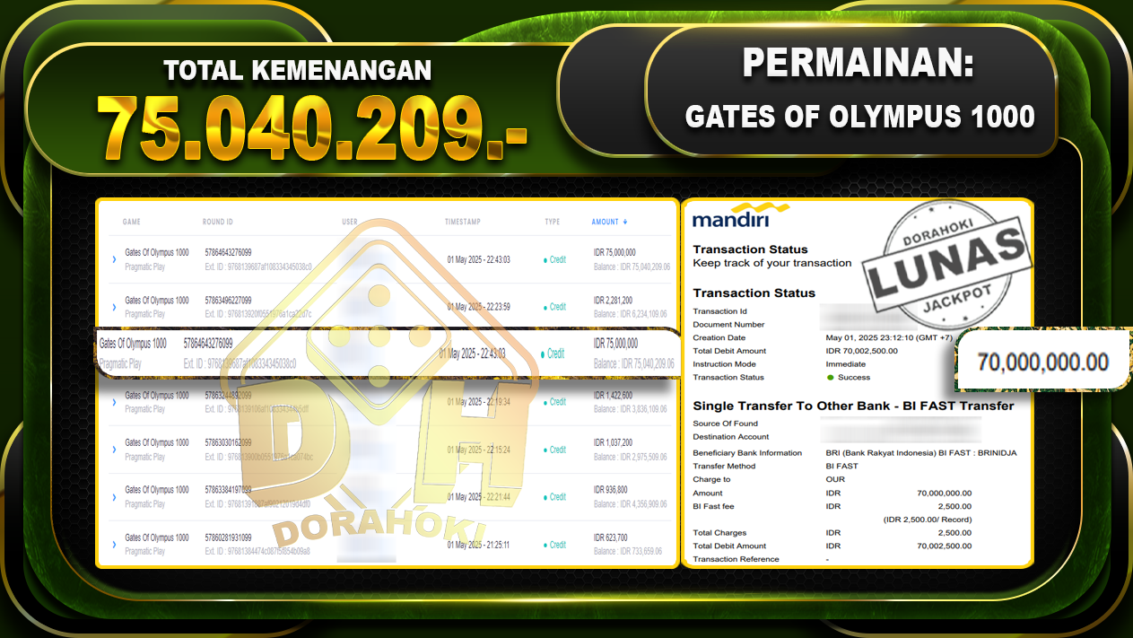 Bukti JP GATES OF OLYMPUS 1000 – ucapkan selamat kepada user id Julxxx atas kemenangan di GATES OF OLYMPUS 1000 dengan total kemenangan Rp.75.040.209,- . Yang pasti nya langsung LUNAS sesuai bukti ya bosku. Dorahoki nih bosku berapapun akan tetap kami bayar lunas ya bosku.