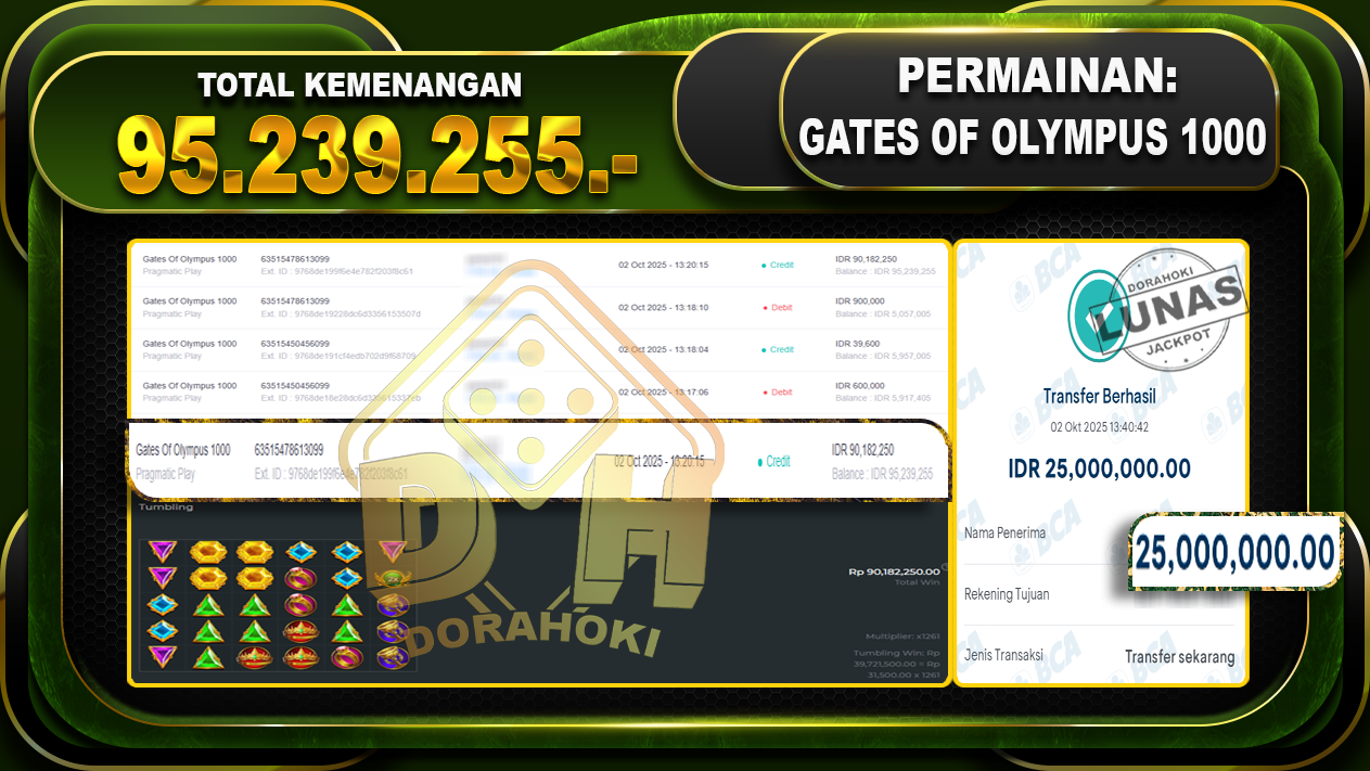 Bukti JP Gates Of Olympus 1000 – ucapkan selamat kepada user id sagxxxxx atas kemenangan di Gates Of Olympus 1000 dengan total kemenangan Rp.95,239.255,- Yang pasti nya langsung LUNAS sesuai bukti ya bosku. Dorahoki nih bosku berapapun akan tetap kami bayar lunas ya bosku