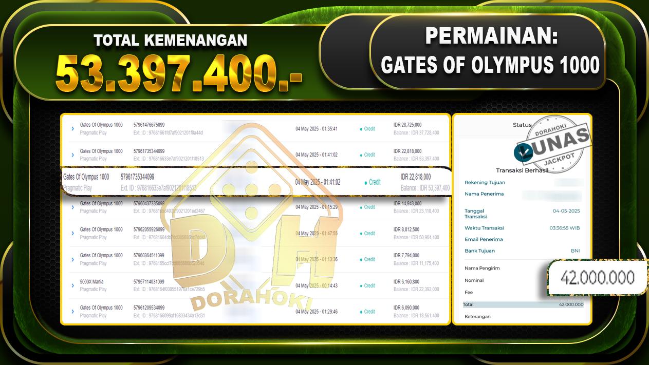 Bukti JP GATES OF OLYMPUS 1000 – ucapkan selamat kepada user id Dogxxx atas kemenangan di GATES OF OLYMPUS 1000 dengan total kemenangan Rp.53.397.400,- . Yang pasti nya langsung LUNAS sesuai bukti ya bosku. Dorahoki nih bosku berapapun akan tetap kami bayar lunas ya bosku.