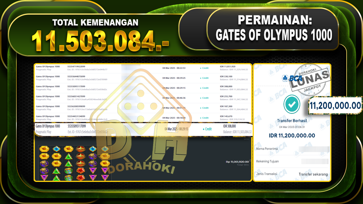 Bukti JP GATES OF OLYMPUS 1000 – ucapkan selamat kepada user id Drhxxx atas kemenangan di GATES OF OLYMPUS 1000 dengan total kemenangan Rp.11.503.084,- . Yang pasti nya langsung LUNAS sesuai bukti ya bosku. Dorahoki nih bosku berapapun akan tetap kami bayar lunas ya bosku.