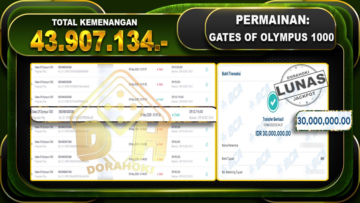 Bukti JP GATES OF OLYMPUS 1000 – ucapkan selamat kepada user id Alexxx atas kemenangan di GATES OF OLYMPUS 1000 dengan total kemenangan Rp.43.907.134,- . Yang pasti nya langsung LUNAS sesuai bukti ya bosku. Dorahoki nih bosku berapapun akan tetap kami bayar lunas ya bosku.