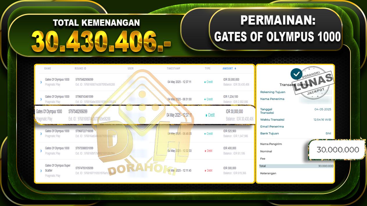 Bukti JP GATES OF OLYMPUS 1000 – ucapkan selamat kepada user id R4yxxx atas kemenangan di GATES OF OLYMPUS 1000 dengan total kemenangan Rp.30.430.406,- . Yang pasti nya langsung LUNAS sesuai bukti ya bosku. Dorahoki nih bosku berapapun akan tetap kami bayar lunas ya bosku.