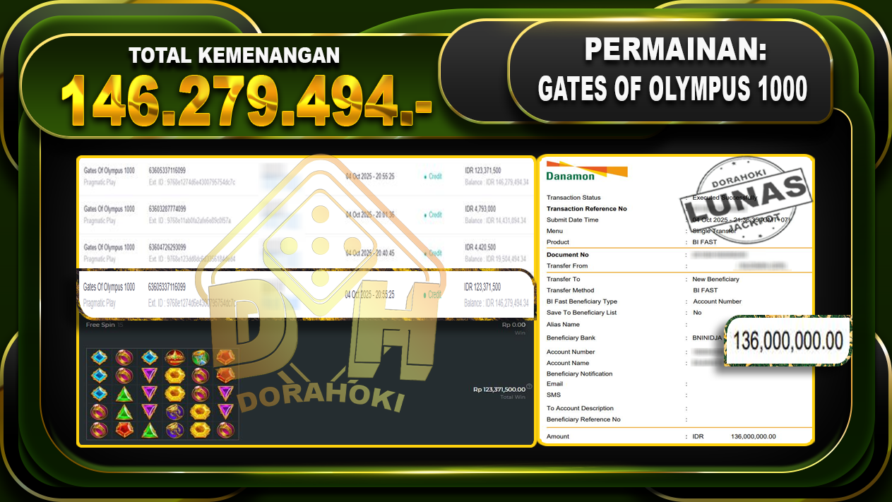 Bukti JP Gates Of Olympus 1000 – ucapkan selamat kepada user id marxxxxx atas kemenangan di Gates Of Olympus 1000 dengan total kemenangan Rp.146,279.494,- Yang pasti nya langsung LUNAS sesuai bukti ya bosku. Dorahoki nih bosku berapapun akan tetap kami bayar lunas ya bosku