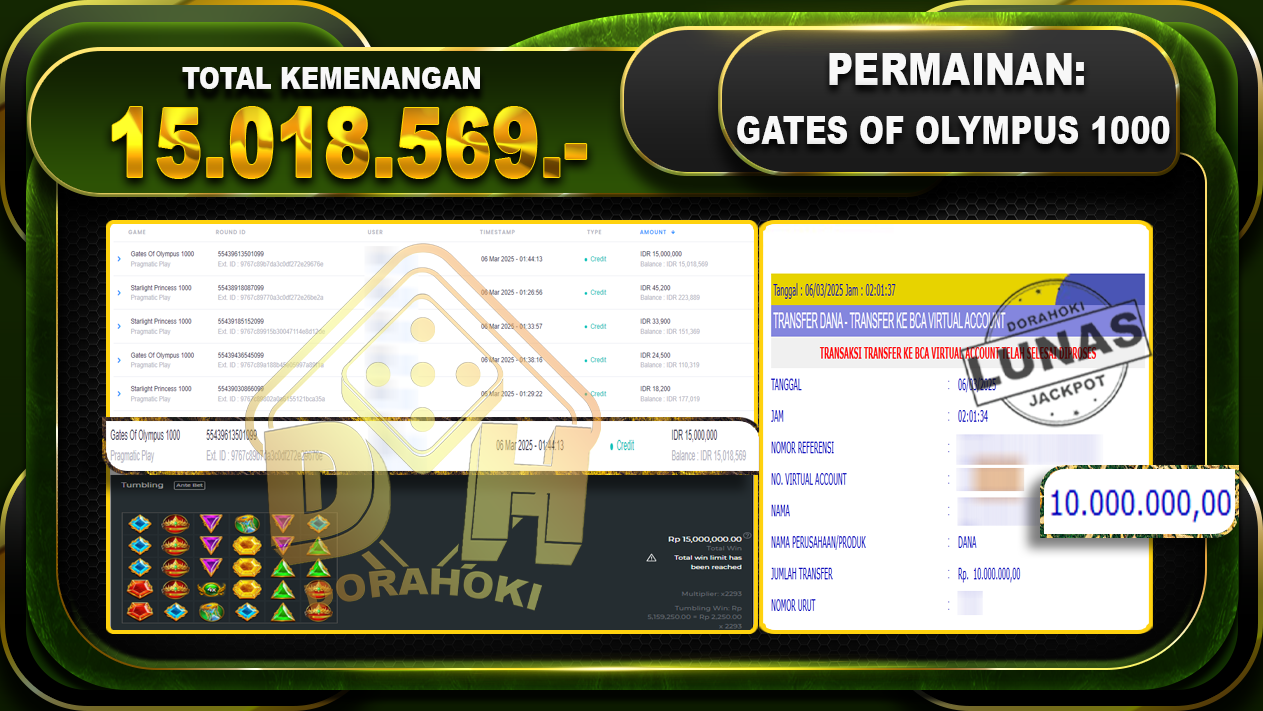 Bukti JP GATES OF OLYMPUS 1000 – ucapkan selamat kepada user id Penxxx atas kemenangan di GATES OF OLYMPUS 1000 dengan total kemenangan Rp.15.018.569,- . Yang pasti nya langsung LUNAS sesuai bukti ya bosku. Dorahoki nih bosku berapapun akan tetap kami bayar lunas ya bosku.