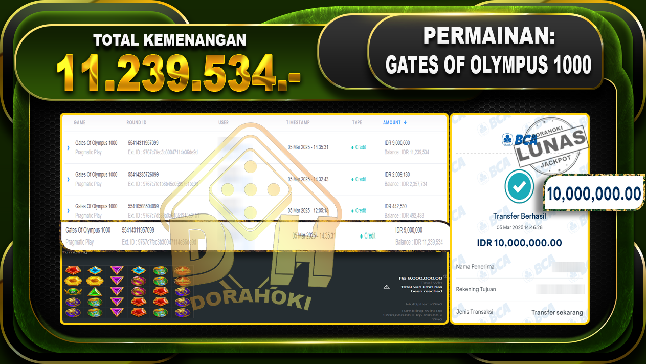 Bukti JP GATES OF OLYMPUS 1000 – ucapkan selamat kepada user id Jaexxx atas kemenangan di GATES OF OLYMPUS 1000 dengan total kemenangan Rp.11.239.534,- . Yang pasti nya langsung LUNAS sesuai bukti ya bosku. Dorahoki nih bosku berapapun akan tetap kami bayar lunas ya bosku.