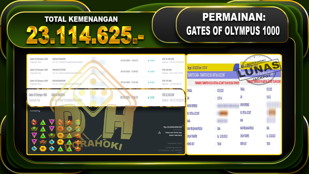 Bukti JP Gates Of Olympus 1000 – ucapkan selamat kepada user id 00xx atas kemenangan di Gates Of Olympus 1000 dengan total kemenangan Rp.23,114.625,- Yang pasti nya langsung LUNAS sesuai bukti ya bosku. Dorahoki nih bosku berapapun akan tetap kami bayar lunas ya bosku