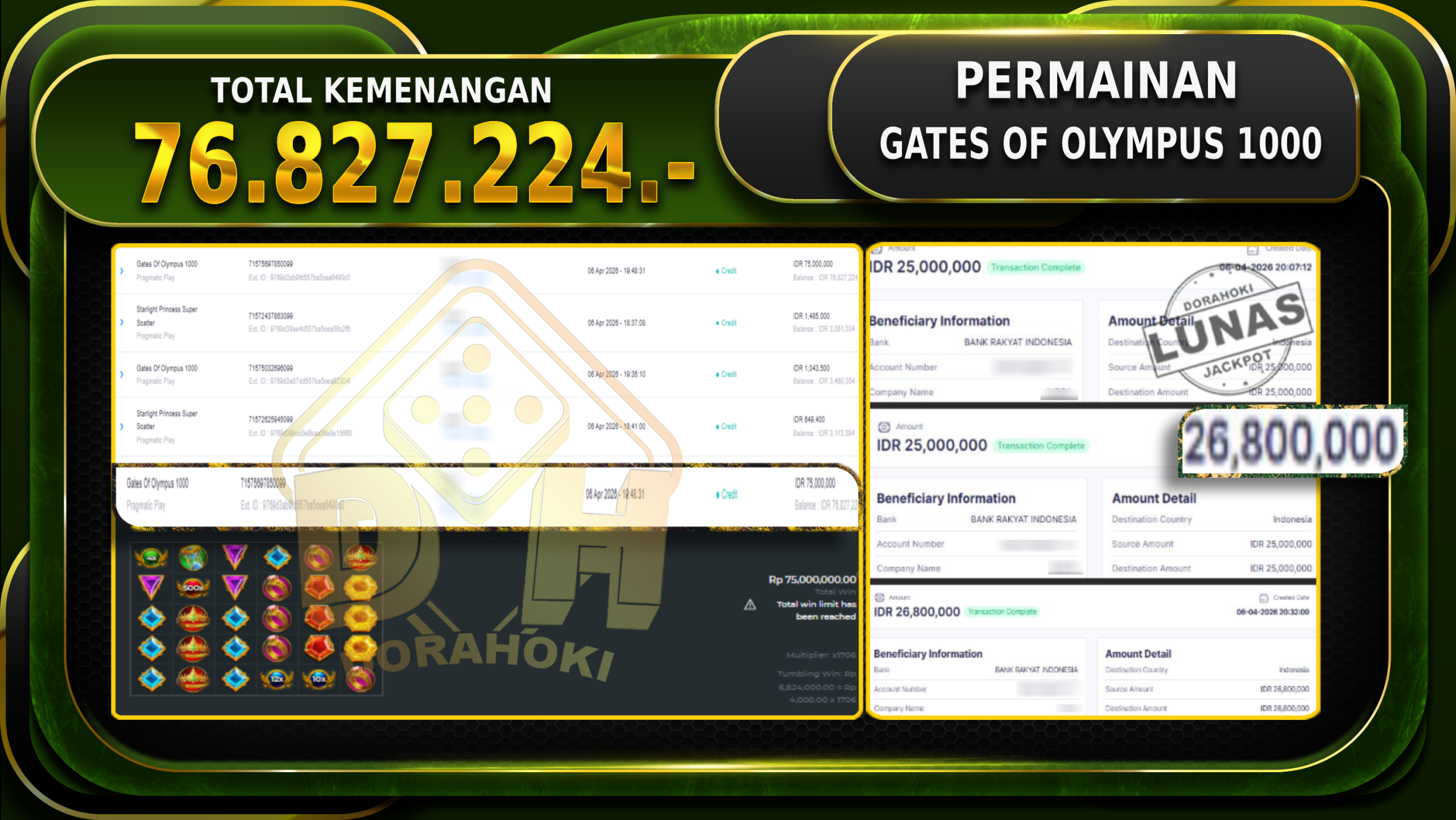 Bukti JP GATES OF OLYMPUS 1000 – ucapkan selamat kepada user id Bosxxxxx atas kemenangan di GATES OF OLYMPUS 1000 dengan total kemenangan Rp.76.827.224,- . Yang pasti nya langsung LUNAS Sesuai Bukti.