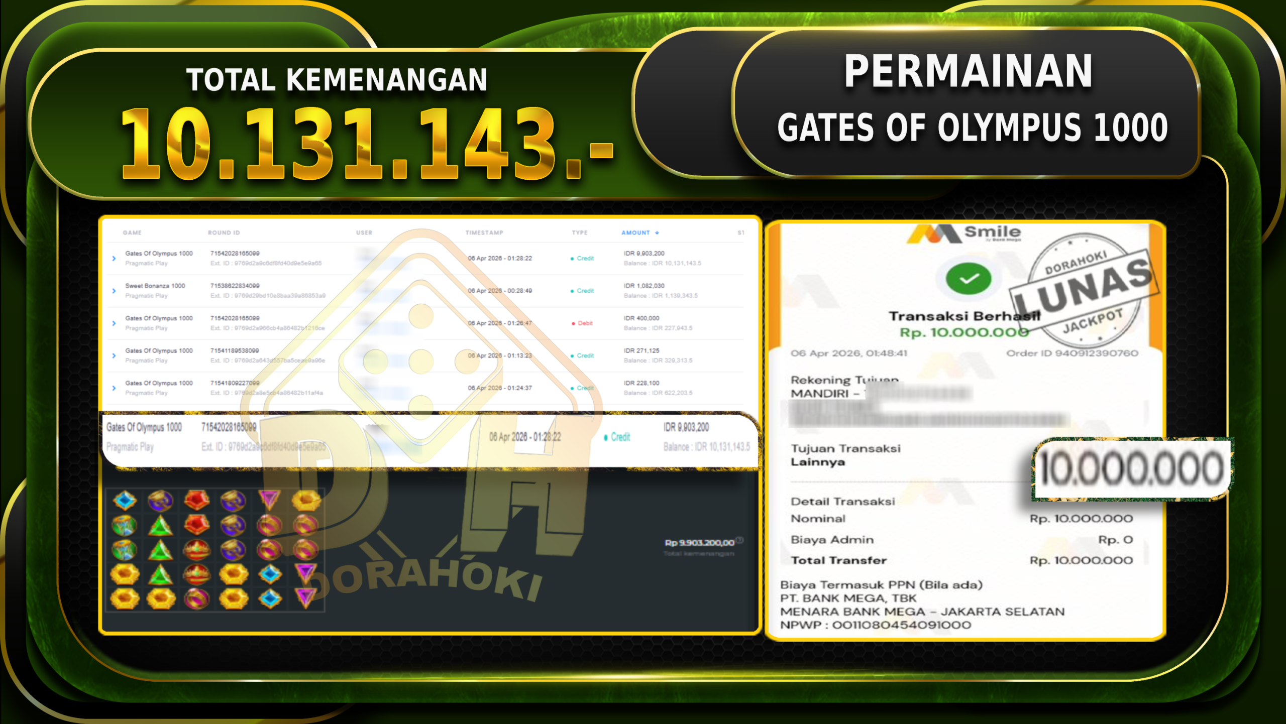 Bukti JP GATES OF OLYMPUS 1000 – ucapkan selamat kepada user id Coixxxxx atas kemenangan di GATES OF OLYMPUS 1000 dengan total kemenangan Rp.10.131.143,- . Yang pasti nya langsung LUNAS Sesuai Bukti.