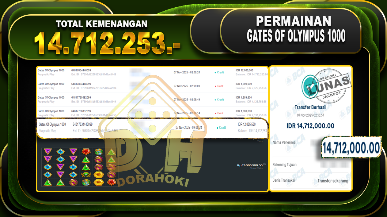 Bukti JP Gates Of Olympus 1000 – ucapkan selamat kepada user id sahxxxxx atas kemenangan di Gates Of Olympus 1000 dengan total kemenangan Rp.14.712.253,- Yang pasti nya langsung LUNAS sesuai bukti ya bosku. Dorahoki nih bosku berapapun akan tetap kami bayar lunas ya bosku