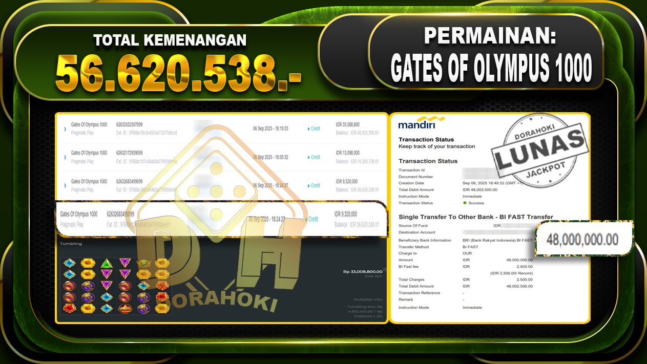 Bukti JP Gates Of Olympus 1000 – ucapkan selamat kepada user id Raixxxxx atas kemenangan di Gates Of Olympus 1000 dengan total kemenangan Rp.56.520.538,- Yang pasti nya langsung LUNAS sesuai bukti ya bosku. Dorahoki nih bosku berapapun akan tetap kami bayar lunas ya bosku