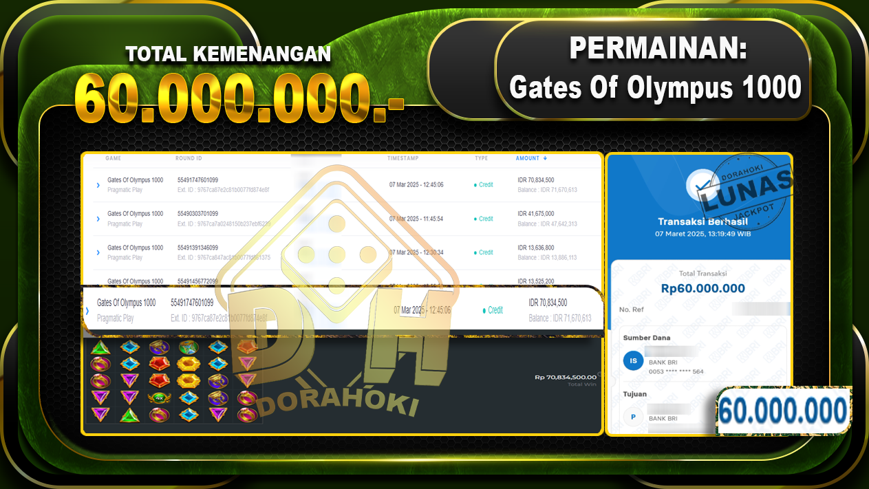 Bukti JP GATES OF OLYMPUS 1000 – ucapkan selamat kepada user id Prixxx atas kemenangan di GATES OF OLYMPUS 1000 dengan total kemenangan Rp.60.000.000,- . Yang pasti nya langsung LUNAS sesuai bukti ya bosku. Dorahoki nih bosku berapapun akan tetap kami bayar lunas ya bosku.