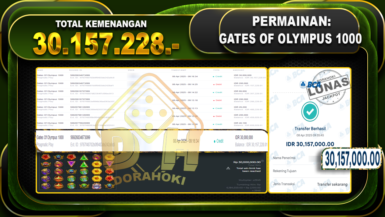 Bukti JP GATES OF OLYMPUS 1000 – ucapkan selamat kepada user id Opixxx atas kemenangan di GATES OF OLYMPUS 1000 dengan total kemenangan Rp.30.157.228,- . Yang pasti nya langsung LUNAS sesuai bukti ya bosku. Dorahoki nih bosku berapapun akan tetap kami bayar lunas ya bosku.