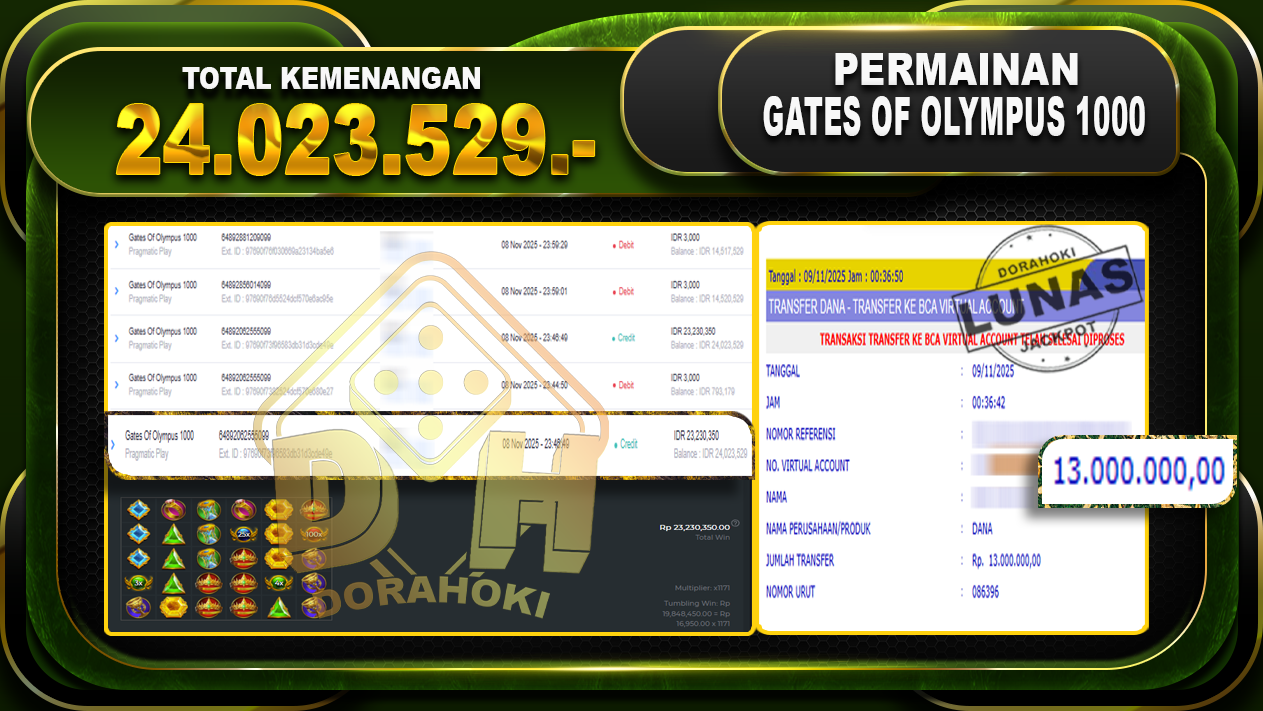 Bukti JP Gates Of Olympus 1000 – ucapkan selamat kepada user id d00xxx atas kemenangan di Gates Of Olympus 1000 dengan total kemenangan Rp.24.023.529,- Yang pasti nya langsung LUNAS sesuai bukti ya bosku. Dorahoki nih bosku berapapun akan tetap kami bayar lunas ya bosku