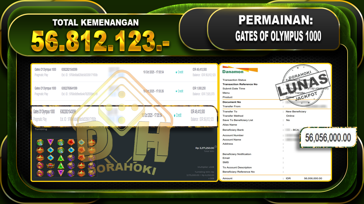 Bukti JP Gates Of Olympus 1000 – ucapkan selamat kepada user id varxxxx atas kemenangan di Gates Of Olympus 1000 dengan total kemenangan Rp.56,812.123,- Yang pasti nya langsung LUNAS sesuai bukti ya bosku. Dorahoki nih bosku berapapun akan tetap kami bayar lunas ya bosku