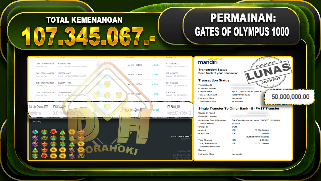 Bukti JP GATES OF OLYMPUS 1000 – ucapkan selamat kepada user id Jitxxx atas kemenangan di GATES OF OLYMPUS 1000 dengan total kemenangan Rp.107.345.067,- . Yang pasti nya langsung LUNAS sesuai bukti ya bosku. Dorahoki nih bosku berapapun akan tetap kami bayar lunas ya bosku.