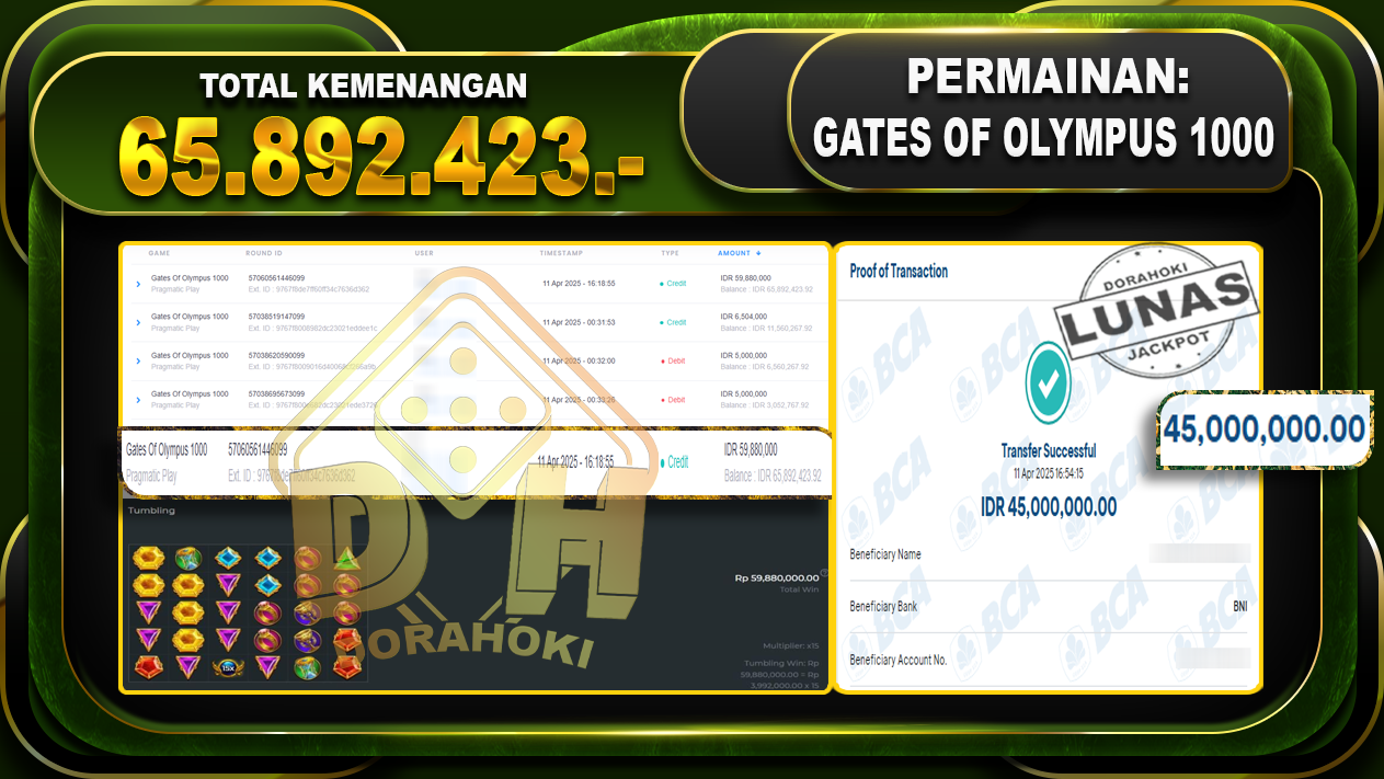 Bukti JP GATES OF OLYMPUS 1000 – ucapkan selamat kepada user id Jitxxx atas kemenangan di GATES OF OLYMPUS 1000 dengan total kemenangan Rp.65.892.423,- . Yang pasti nya langsung LUNAS sesuai bukti ya bosku. Dorahoki nih bosku berapapun akan tetap kami bayar lunas ya bosku.