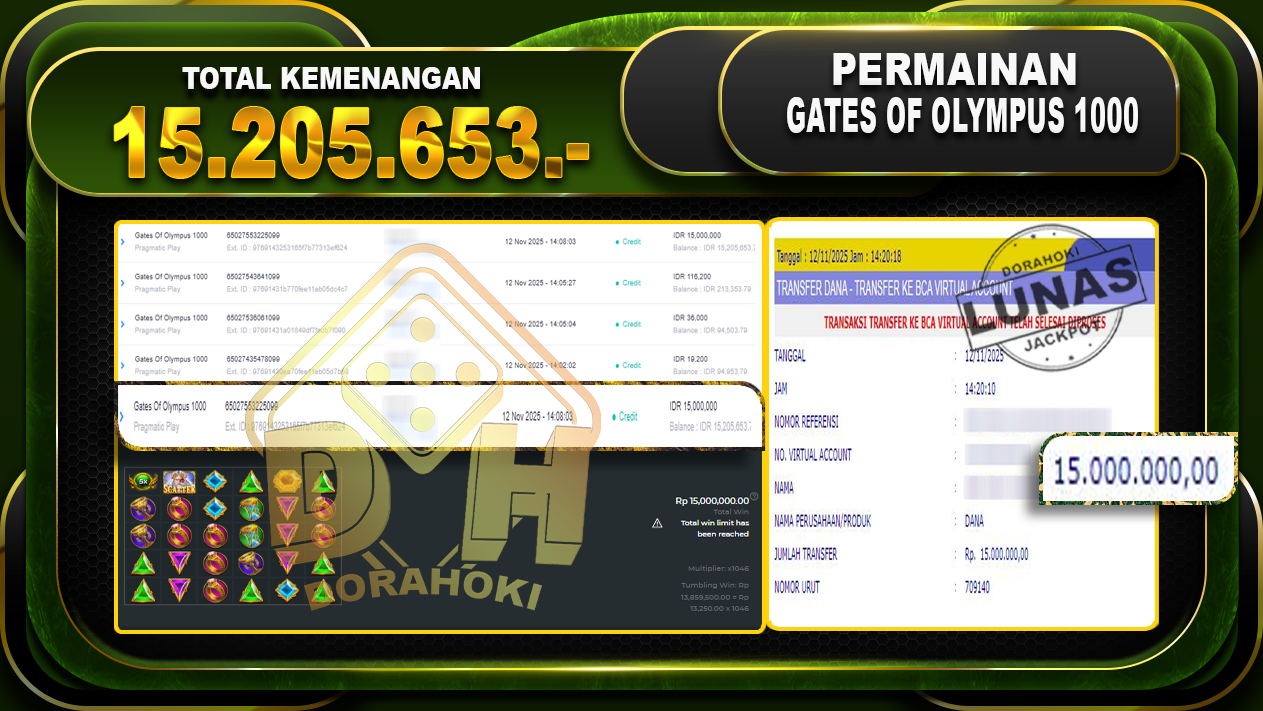 Bukti JP Gates Of Olympus 1000 – ucapkan selamat kepada user id kasxxxxx atas kemenangan di Gates Of Olympus 1000 dengan total kemenangan Rp.15.205.653,- Yang pasti nya langsung LUNAS sesuai bukti ya bosku. Dorahoki nih bosku berapapun akan tetap kami bayar lunas ya bosku