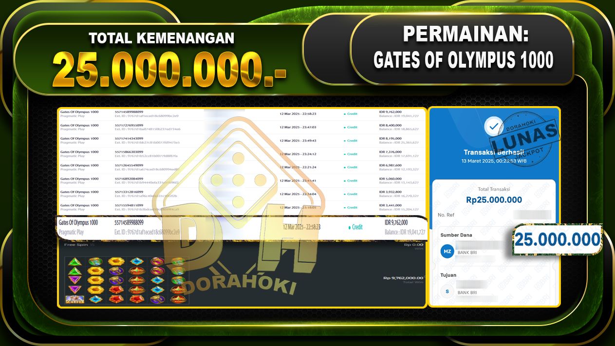 Bukti JP GATES OF OLYMPUS 1000 – ucapkan selamat kepada user id Dasxxx atas kemenangan di GATES OF OLYMPUS 1000 dengan total kemenangan Rp.25.000.000,- . Yang pasti nya langsung LUNAS sesuai bukti ya bosku. Dorahoki nih bosku berapapun akan tetap kami bayar lunas ya bosku.