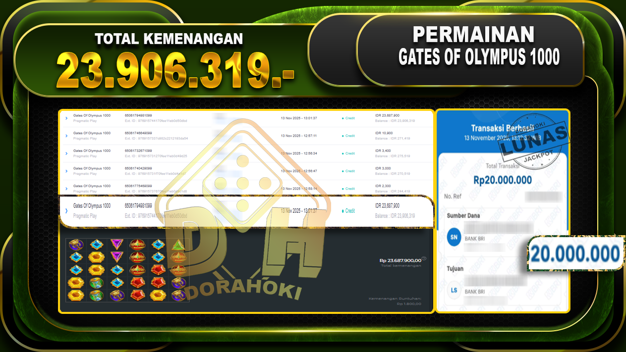 Bukti JP Gates Of Olympus 1000 – ucapkan selamat kepada user id katxxxx atas kemenangan di Gates Of Olympus 1000 dengan total kemenangan Rp.23.906.319,- Yang pasti nya langsung LUNAS sesuai bukti ya bosku. Dorahoki nih bosku berapapun akan tetap kami bayar lunas ya bosku