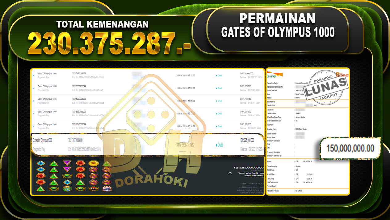 Bukti JP Gates Of Olympus 1000 – Selamat Kepada User ID : Kitxxx atas kemenangan Gates Of Olympus 1000 Dengan Nominal Sebesar Rp 230.375.287,- . Yang pasti nya langsung LUNAS Sesuai Bukti.