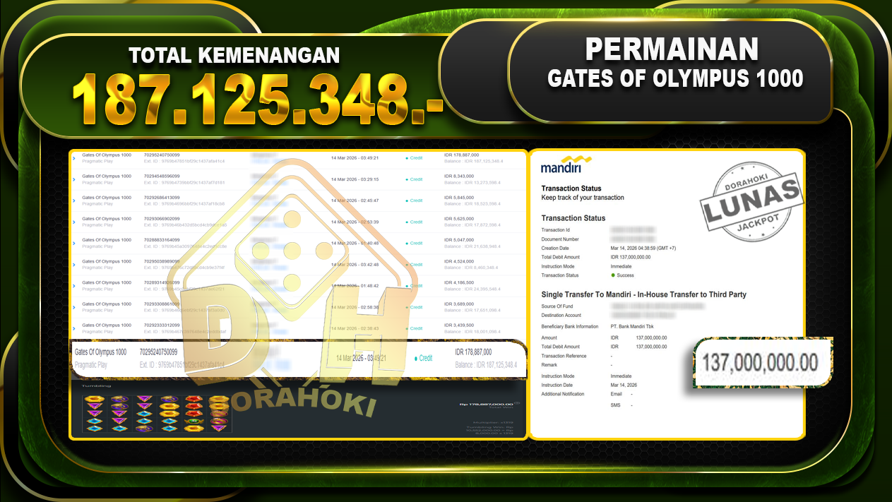 Bukti JP Gates Of Olympus 1000 Selamat Kepada User ID : Kitxxx atas kemenangan Gates Of Olympus 1000 Dengan Nominal Sebesar Rp 187.125.348,- . Yang pasti nya langsung LUNAS Sesuai Bukti.