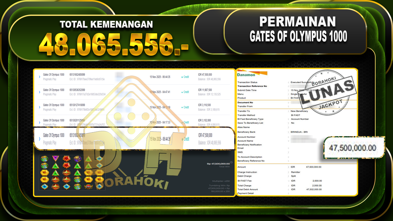 Bukti JP Gates Of Olympus 1000 – ucapkan selamat kepada user id akaxxxx atas kemenangan di Gates Of Olympus 1000 dengan total kemenangan Rp.48.065.565,- Yang pasti nya langsung LUNAS sesuai bukti ya bosku. Dorahoki nih bosku berapapun akan tetap kami bayar lunas ya bosku