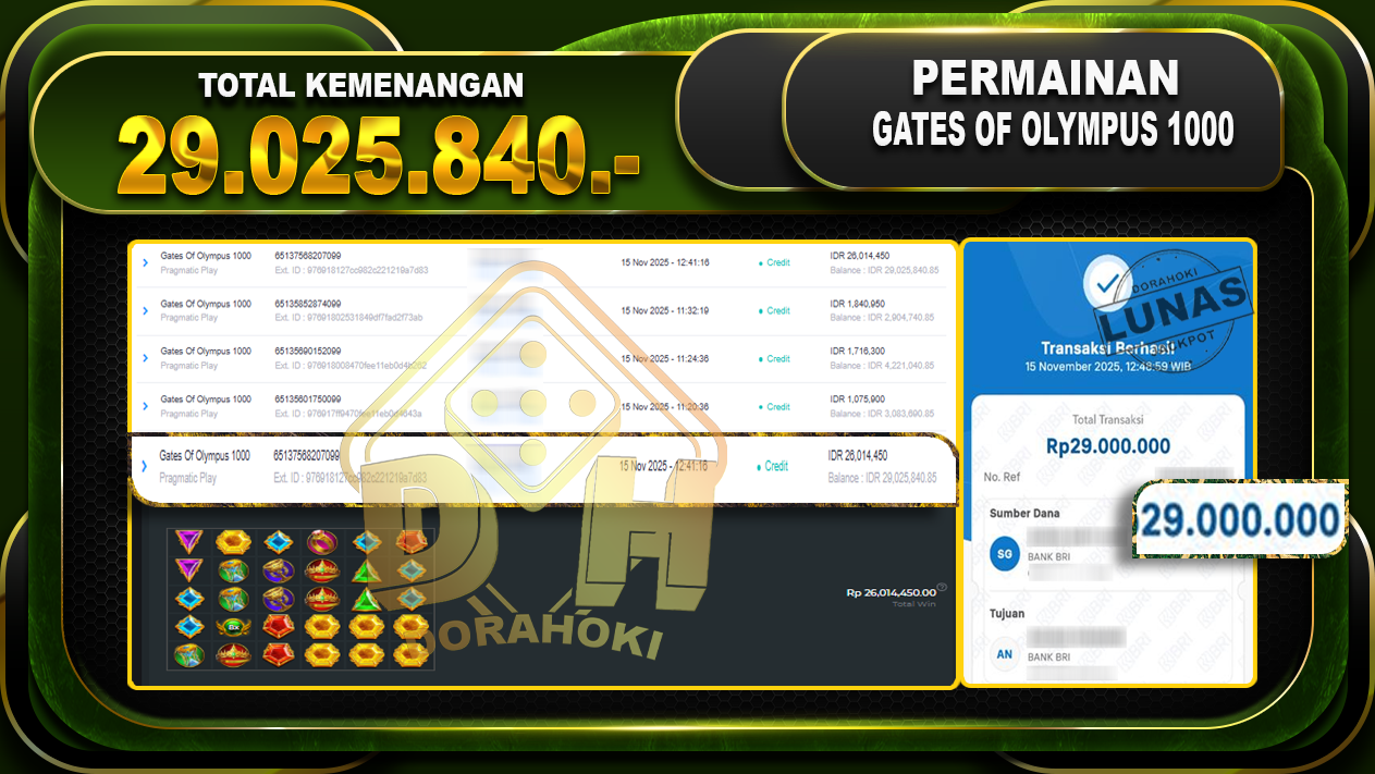 Bukti JP Gates Of Olympus 1000 – ucapkan selamat kepada user id dorxxxxx atas kemenangan di  Gates Of Olympus 1000 dengan total kemenangan Rp.29.025.840,- Yang pasti nya langsung LUNAS sesuai bukti ya bosku. Dorahoki nih bosku berapapun akan tetap kami bayar lunas ya bosku