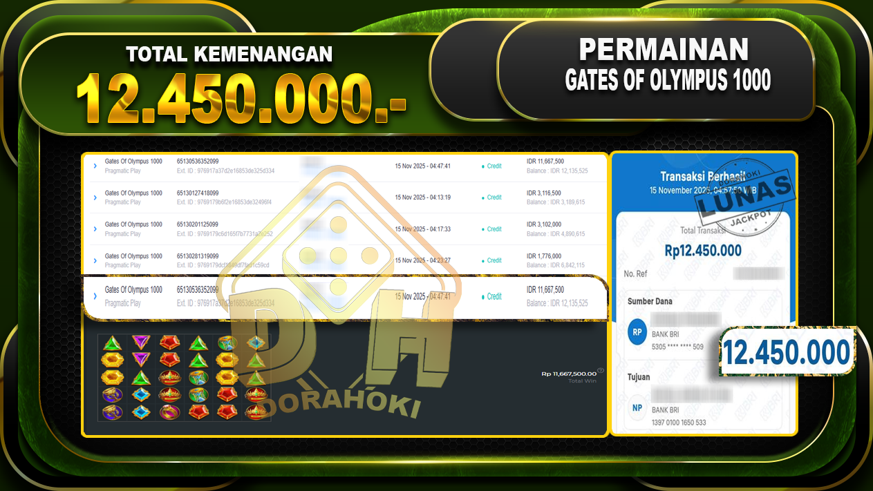Bukti JP Gates Of Olympus 1000 – ucapkan selamat kepada user id akaxxxx atas kemenangan di Gates Of Olympus 1000 dengan total kemenangan Rp.12.450.000,- Yang pasti nya langsung LUNAS sesuai bukti ya bosku. Dorahoki nih bosku berapapun akan tetap kami bayar lunas ya bosku