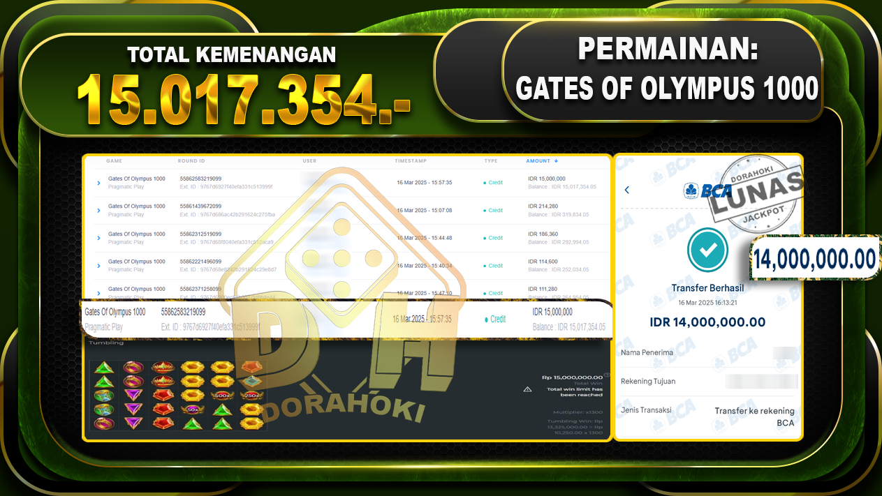 Bukti JP GATES OF OLYMPUS 1000 – ucapkan selamat kepada user id Merxxx atas kemenangan di GATES OF OLYMPUS 1000 dengan total kemenangan Rp.15.017.354,- . Yang pasti nya langsung LUNAS sesuai bukti ya bosku. Dorahoki nih bosku berapapun akan tetap kami bayar lunas ya bosku.