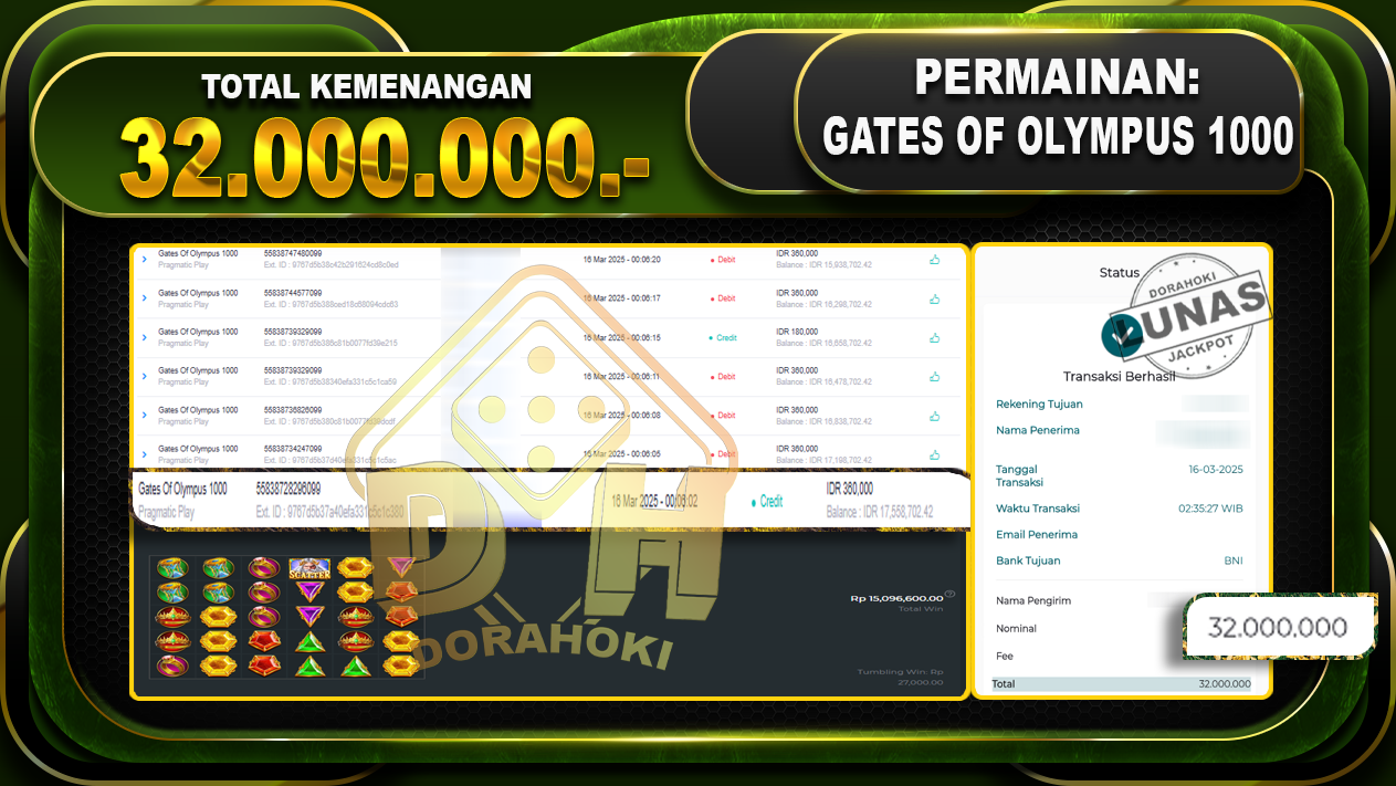 Bukti JP GATES OF OLYMPUS 1000 – ucapkan selamat kepada user id Jitxxx atas kemenangan di GATES OF OLYMPUS 1000 dengan total kemenangan Rp.32.000.000,- . Yang pasti nya langsung LUNAS sesuai bukti ya bosku. Dorahoki nih bosku berapapun akan tetap kami bayar lunas ya bosku.