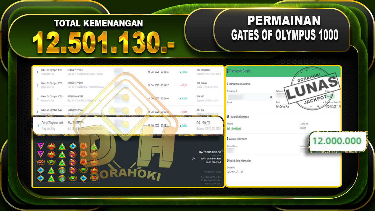 Bukti JP Gates Of Olympus 1000 – ucapkan selamat kepada user id damxxxxx atas kemenangan di Gates Of Olympus 1000 dengan total kemenangan Rp.12.501.130,- Yang pasti nya langsung LUNAS sesuai bukti ya bosku. Dorahoki nih bosku berapapun akan tetap kami bayar lunas ya bosku