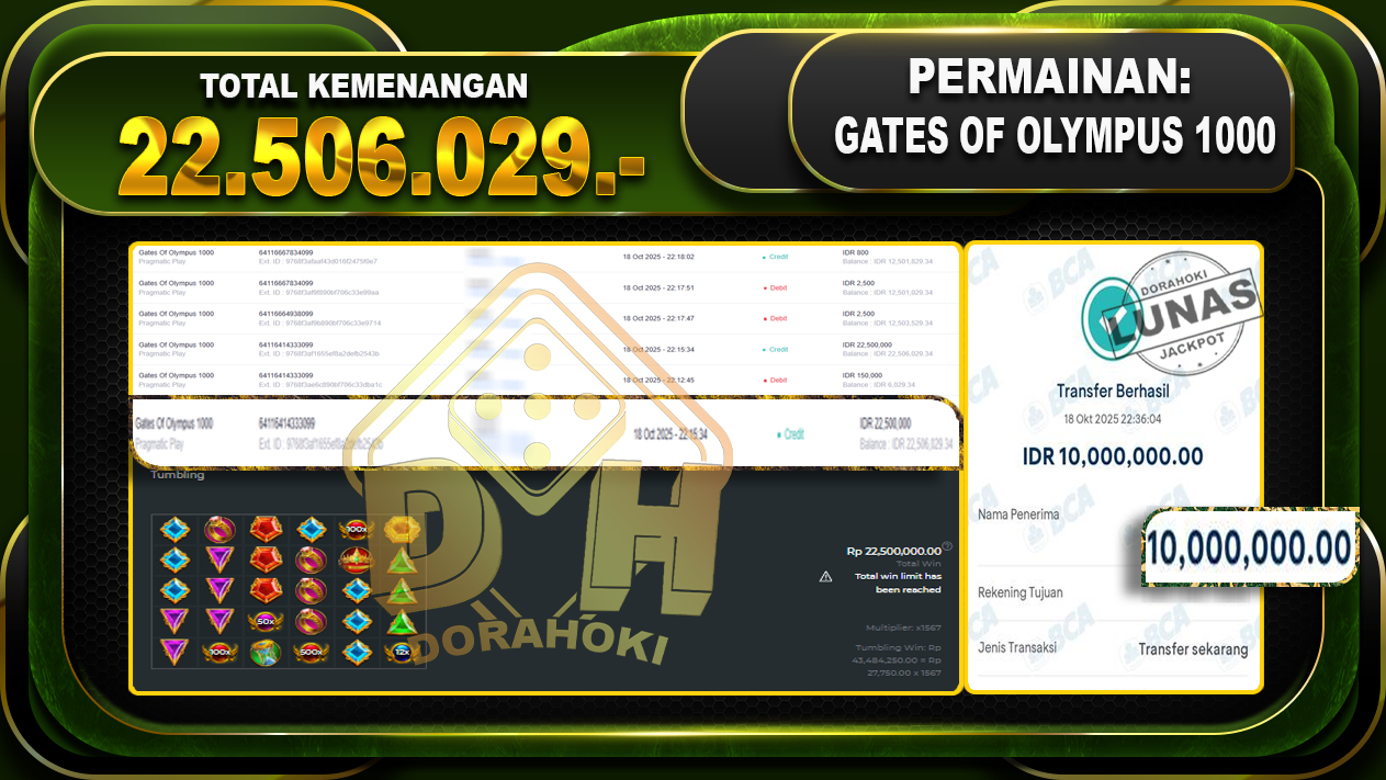 Bukti JP Gates Of Olympus 1000 – ucapkan selamat kepada user id henxxxxx atas kemenangan di Gates Of Olympus 1000 dengan total kemenangan Rp.22,506,029,- Yang pasti nya langsung LUNAS sesuai bukti ya bosku. Dorahoki nih bosku berapapun akan tetap kami bayar lunas ya bosku