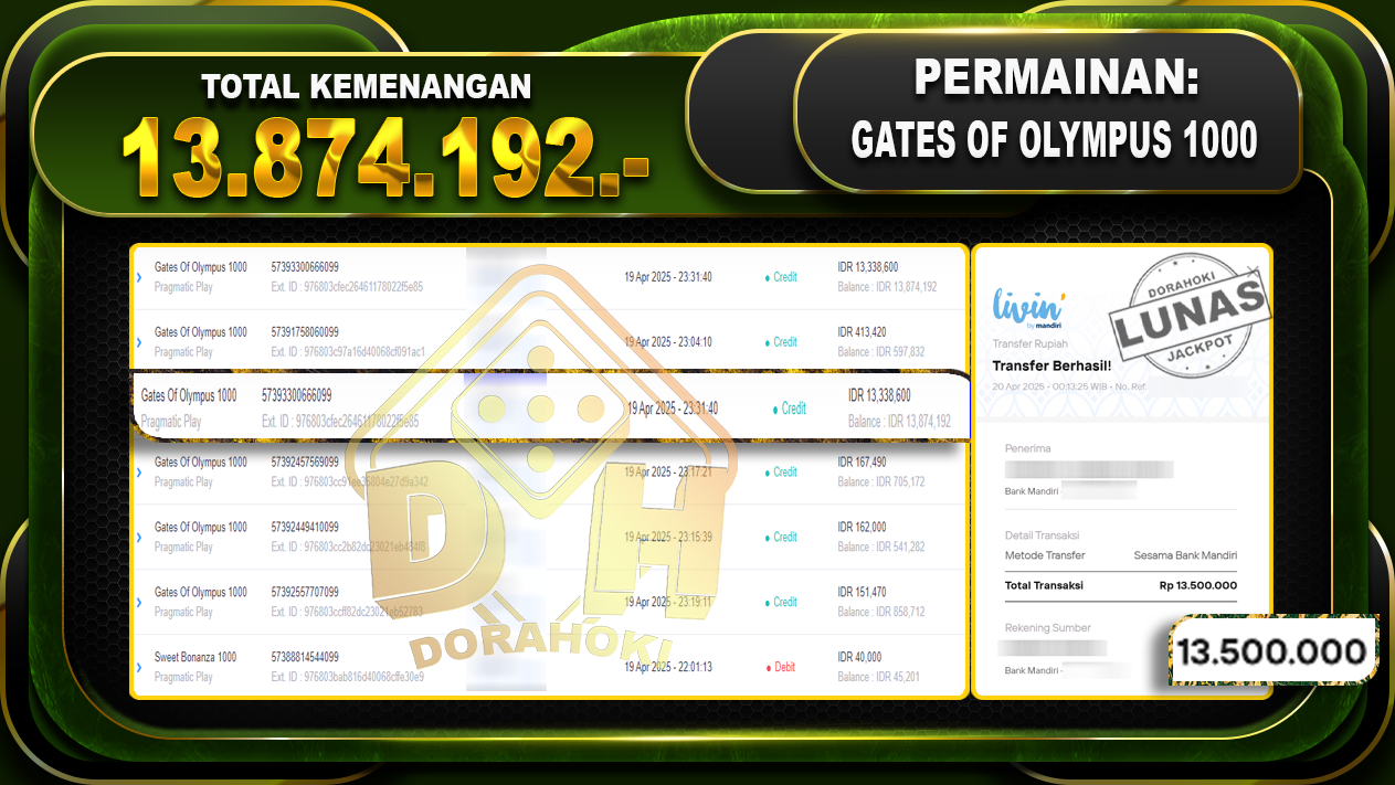 Bukti JP GATES OF OLYMPUS 1000 – ucapkan selamat kepada user id Terxxx atas kemenangan di GATES OF OLYMPUS 1000 dengan total kemenangan Rp.13.874.192,- . Yang pasti nya langsung LUNAS sesuai bukti ya bosku. Dorahoki nih bosku berapapun akan tetap kami bayar lunas ya bosku.