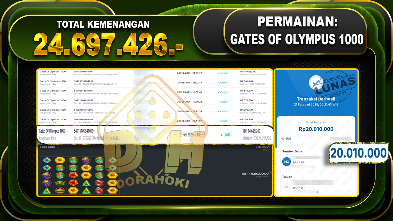 Bukti JP GATES OF OLYMPUS 1000 – ucapkan selamat kepada user id ASEPRAxxx atas kemenangan di GATES OF OLYMPUS 1000 dengan total kemenangan Rp.24.697.426,- . Yang pasti nya langsung LUNAS sesuai bukti ya bosku. Dorahoki nih bosku berapapun akan tetap kami bayar lunas ya bosku.