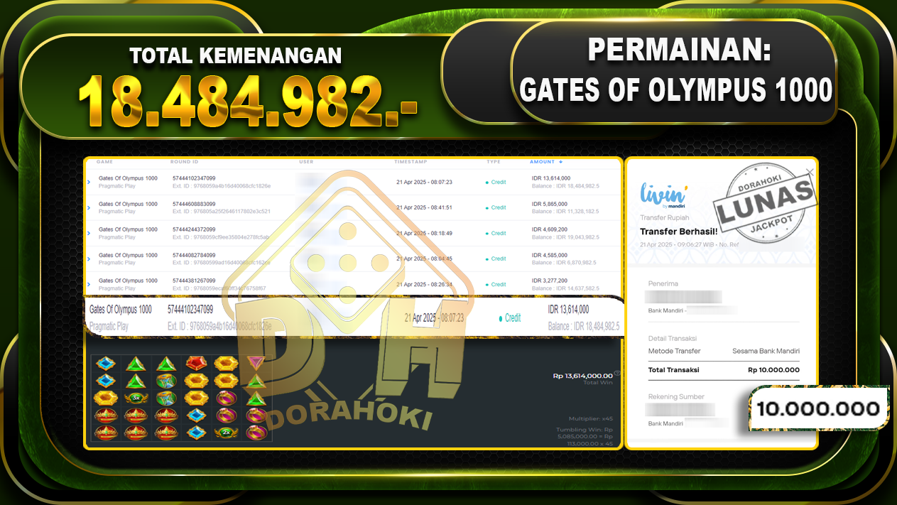 Bukti JP GATES OF OLYMPUS 1000 – ucapkan selamat kepada user id Dogxxx atas kemenangan di GATES OF OLYMPUS 1000 dengan total kemenangan Rp.18.484.982,- . Yang pasti nya langsung LUNAS sesuai bukti ya bosku. Dorahoki nih bosku berapapun akan tetap kami bayar lunas ya bosku.