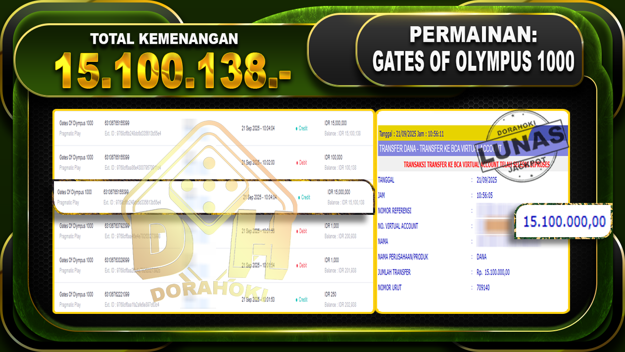 Bukti JP Gates Of Olympus 1000 – ucapkan selamat kepada user id ilhxxxxx atas kemenangan di Gates Of Olympus 1000 dengan total kemenangan Rp.15,100.138,- Yang pasti nya langsung LUNAS sesuai bukti ya bosku. Dorahoki nih bosku berapapun akan tetap kami bayar lunas ya bosku