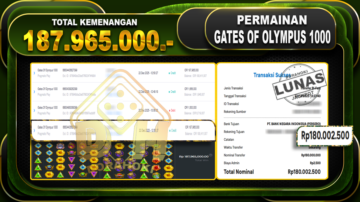 Bukti JP Gates Of Olympus 1000 – ucapkan selamat kepada user id marxxxxx atas kemenangan di  Gates Of Olympus 1000 dengan total kemenangan Rp.187.965.000,- Yang pasti nya langsung LUNAS sesuai bukti ya bosku. Dorahoki nih bosku berapapun akan tetap kami bayar lunas ya bosku