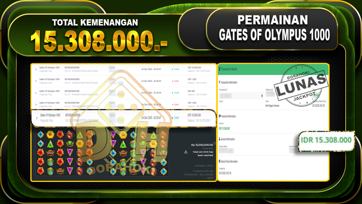 Bukti JP Gates Of Olympus 1000 – ucapkan selamat kepada user id tolxxxxx atas kemenangan di Gates Of Olympus 1000 dengan total kemenangan Rp.15.308.000,- Yang pasti nya langsung LUNAS sesuai bukti ya bosku. Dorahoki nih bosku berapapun akan tetap kami bayar lunas ya bosku