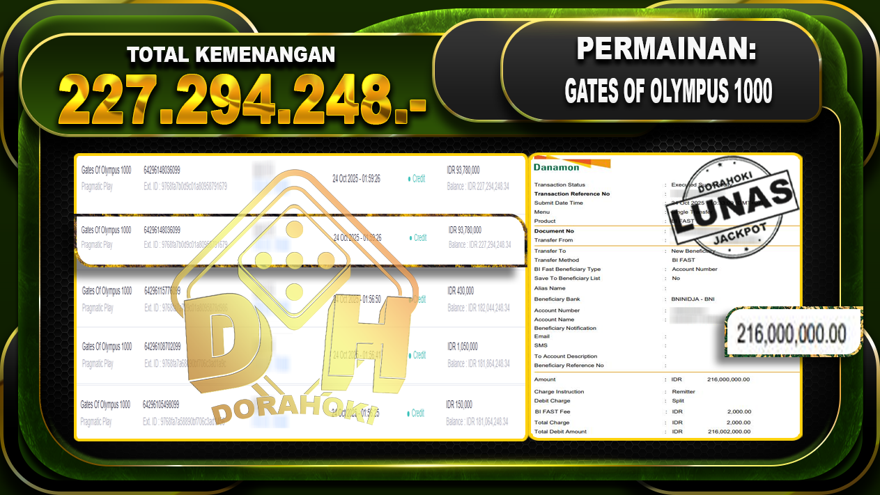 Bukti JP Gates Of Olympus 1000 – ucapkan selamat kepada user id marxxxx atas kemenangan di Gates Of Olympus 1000 dengan total kemenangan Rp.227,294,248,- Yang pasti nya langsung LUNAS sesuai bukti ya bosku. Dorahoki nih bosku berapapun akan tetap kami bayar lunas ya bosku