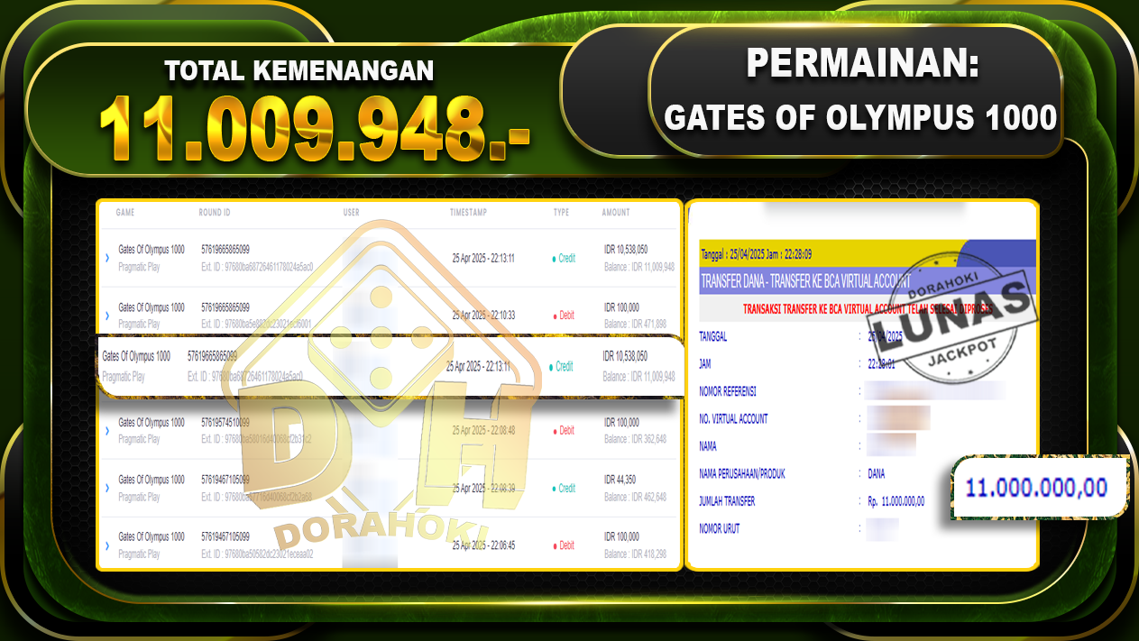 Bukti JP GATES OF OLYMPUS 1000 – ucapkan selamat kepada user id Warxxx atas kemenangan di GATES OF OLYMPUS 1000 dengan total kemenangan Rp.11.009.948,- . Yang pasti nya langsung LUNAS sesuai bukti ya bosku. Dorahoki nih bosku berapapun akan tetap kami bayar lunas ya bosku.