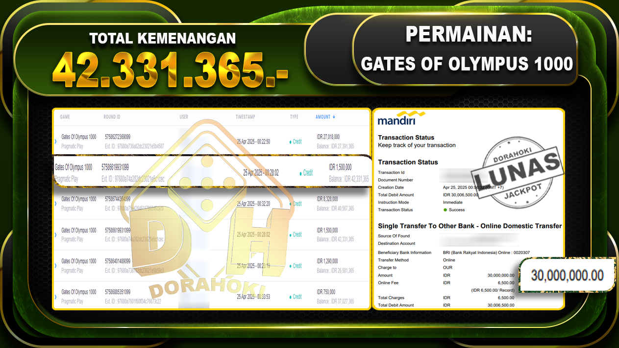 Bukti JP GATES OF OLYMPUS 1000 – ucapkan selamat kepada user id Prixxx atas kemenangan di GATES OF OLYMPUS 1000 dengan total kemenangan Rp.42.331.365,- . Yang pasti nya langsung LUNAS sesuai bukti ya bosku. Dorahoki nih bosku berapapun akan tetap kami bayar lunas ya bosku.