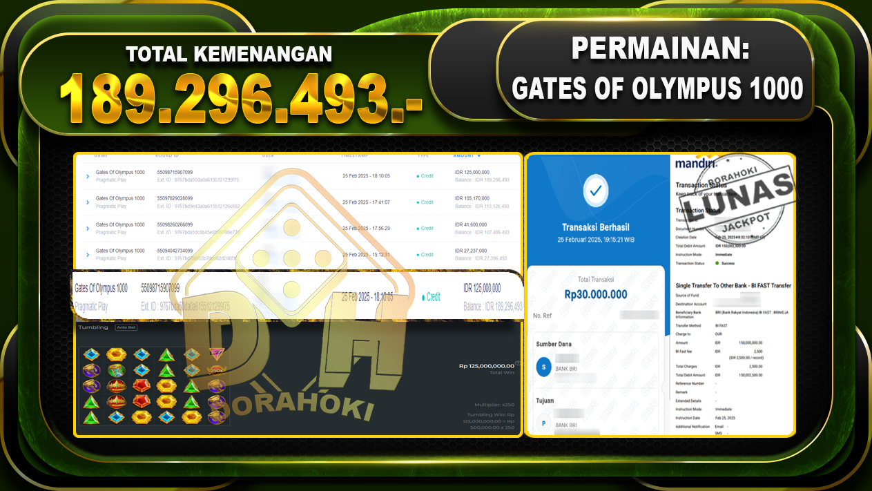 Bukti JP GATES OF OLYMPUS 1000 – ucapkan selamat kepada user id PRIxxx atas kemenangan di GATES OF OLYMPUS 1000 dengan total kemenangan Rp.189.296.493,- . Yang pasti nya langsung LUNAS sesuai bukti ya bosku. Dorahoki nih bosku berapapun akan tetap kami bayar lunas ya bosku.